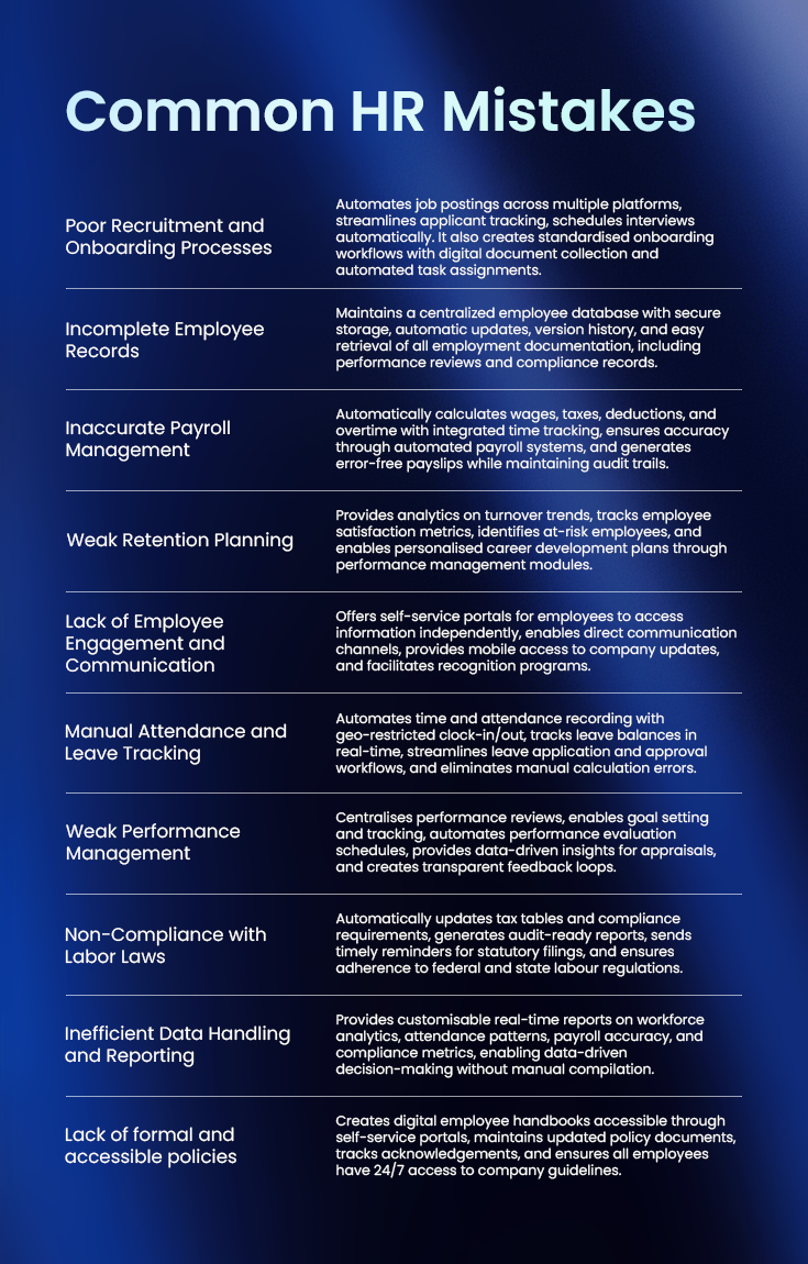 Payroll errors can perhaps be the most damaging HR mistake you are most likely to commit. These errors can be due to manual calculation, incorrect entry of hours, misclassification of employees (e.g., exempt vs. non-exempt), or missed tax updates. It can even result in a complete erosion of employee trust.